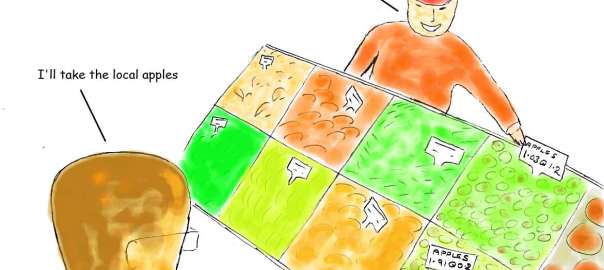 There are two types of apple on display. The first have been grown in the South, in an area where apples grow well and wages are low, so their money cost is low. Their Q cost reflects the use of artificial fertiliser, mechanised agriculture, and long distance transport, and is relatively high. The calculation is realistic because every business involved in the supply must pass on the Q of the items or services that it supplies.