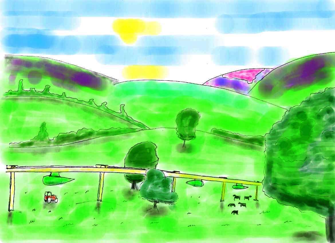 The pod is moved up to the overhead rail, which runs above the streets. It sets off and soon it is in open countryside. It runs at a steady 60mph (100kph), never needing to stop for intersections.