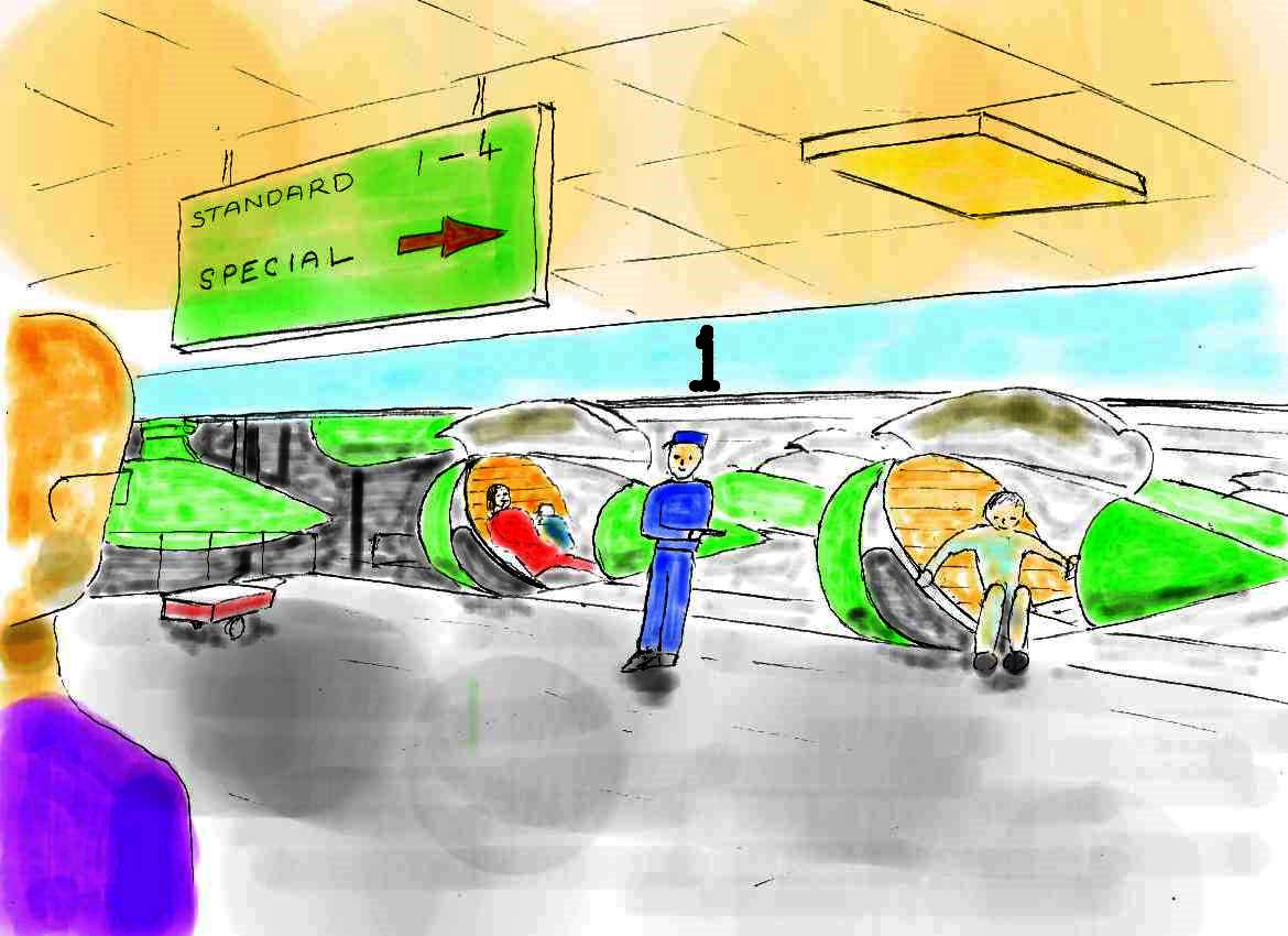He walks straight in a ground level and goes to Platform 1, since he is travelling alone and that platform has standard pods. A Swiftpod has just arrived and the attendant waves him across. Everyone sits in the Swift facing backwards, which takes a little getting used to but means that there is no need for seat belts. If there is a problem and the pod brakes heavily he will simply sink into the seat. Jim swipes his card and touches the screen for his destination.
