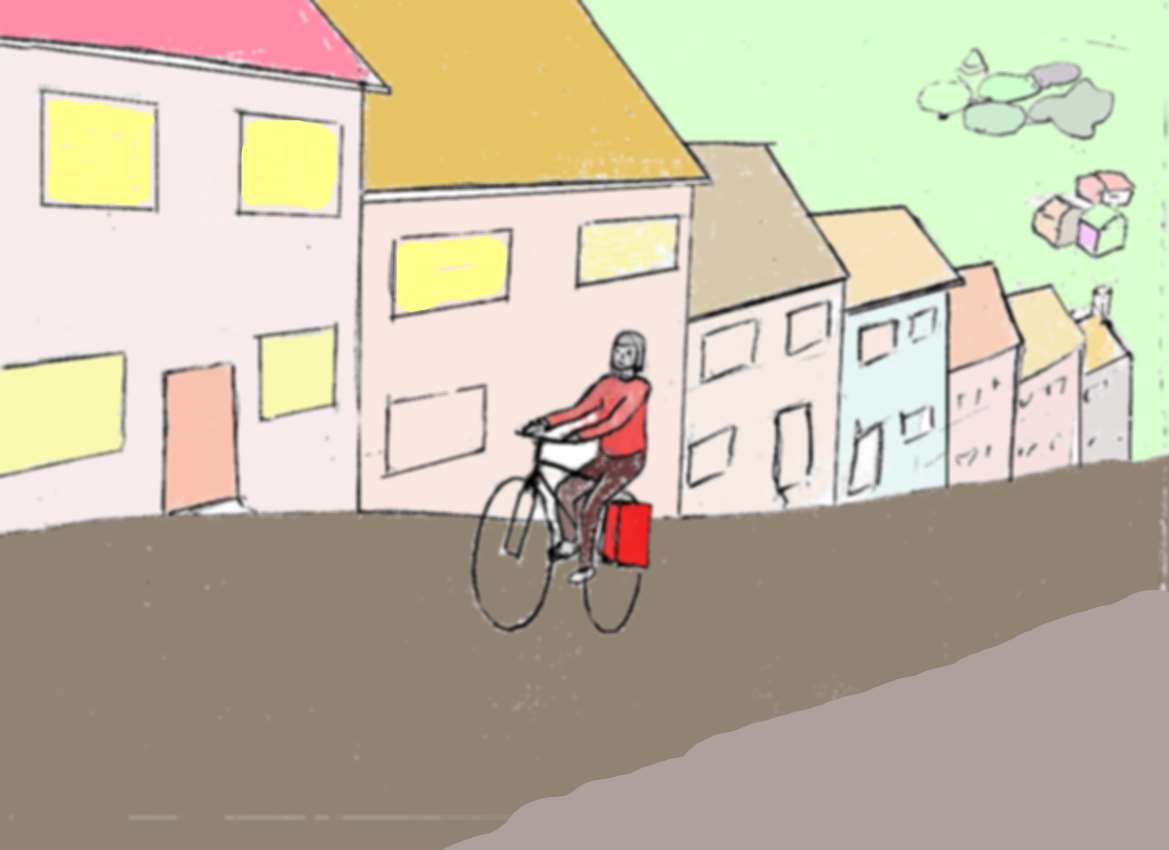 It is 2050. Pete is a young professional who lives at the top of a hill. The local town, including the shops, the railway, and the restaurants are at the bottom. After shopping in the town he loads his beer into the panniers, and cycles easily home up the hill. When he gets home he isn’t even sweating.