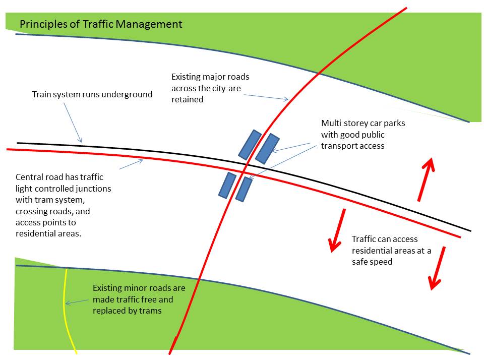 The aim is to house millions of people but ensure that none are more than a mile from open countryside. Public transport is provided in the form of trams and trains. Cycleways are built into the city from the outset. Housing density is high so that distances are short. Energy consumption on travel and home heating will be less than 20% of current UK average levels. At that level renewable energy could meet the need, making the city effectively zero carbon.