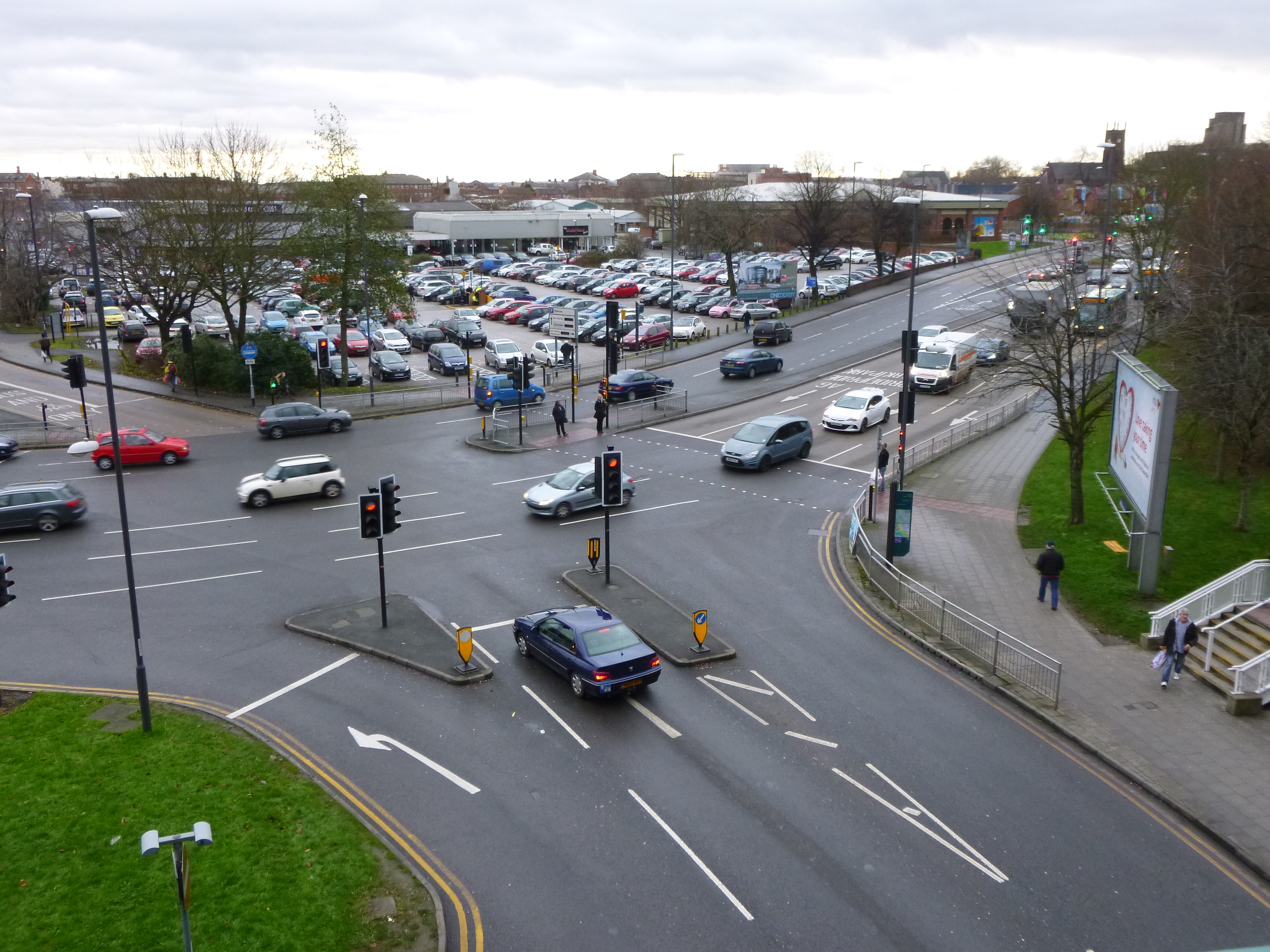 The photo shows the extent to which private cars are dominating the city. The road junction is wide and hard to cross. The pavements are noisy. The area beyond is a car park. This street is actually called Traffic Street.