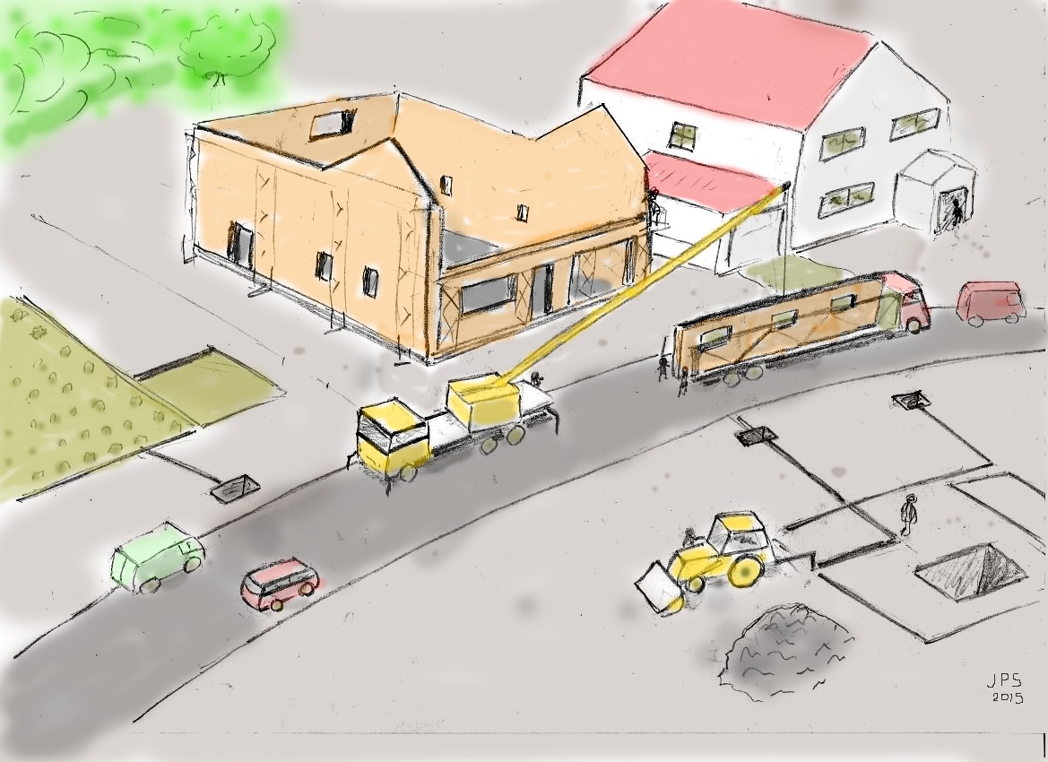 In the background a new house is being built. Once the foundations are in the process is relatively rapid, with sections being built off site and craned into place – a process made possible by the use of wooden construction. These new homes are relatively large, reflecting the fact that many people will be wealthy. Most people will live in cities, but even there high rise apartments should be spacious by 2015 standards. All houses, whatever their type, will tend to use wooden construction where possible.